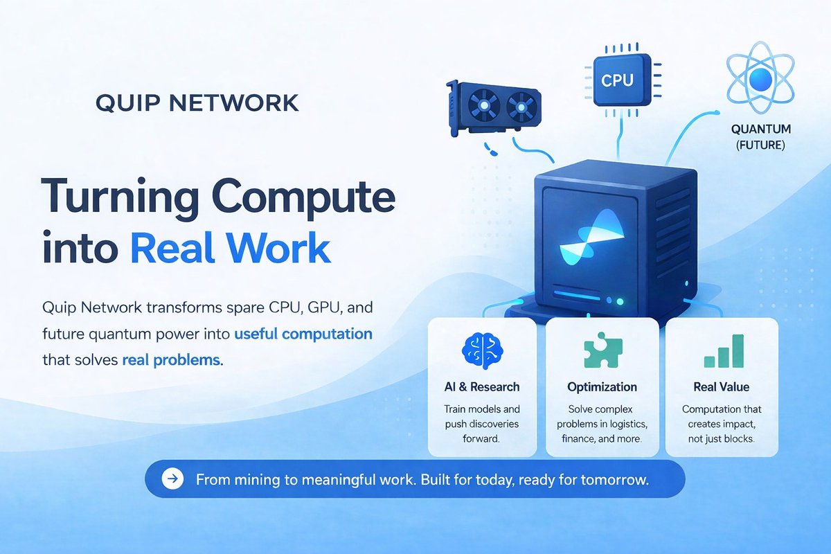 Quip Network Turning Compute into Real Work. Most blockchain networks rely on computation that does little beyond securing the chain. large amounts of energy spent on repetitive tasks. Quip Network explores a different direction. turning compute into something useful. Instead of traditional mining. the network distributes real workloads across CPU and GPU resources. including tasks linked to AI