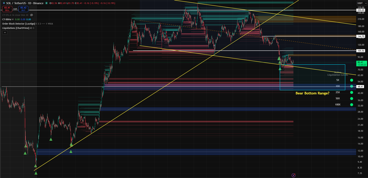 @shahh IMAGE 1: If #bitcoin breaks down to our target at 48k, #solana should be entering it's own bear bottom range as well. This sits between our Bear Bottom Hunter signals (green arrows) between 78.5 and 44.7 USD which forms the bottom range seen in the image below. Previous bear bottom signals gave us essentially perfect opportunities to buy the deep-end of the bear. Liquidations on $SOL en